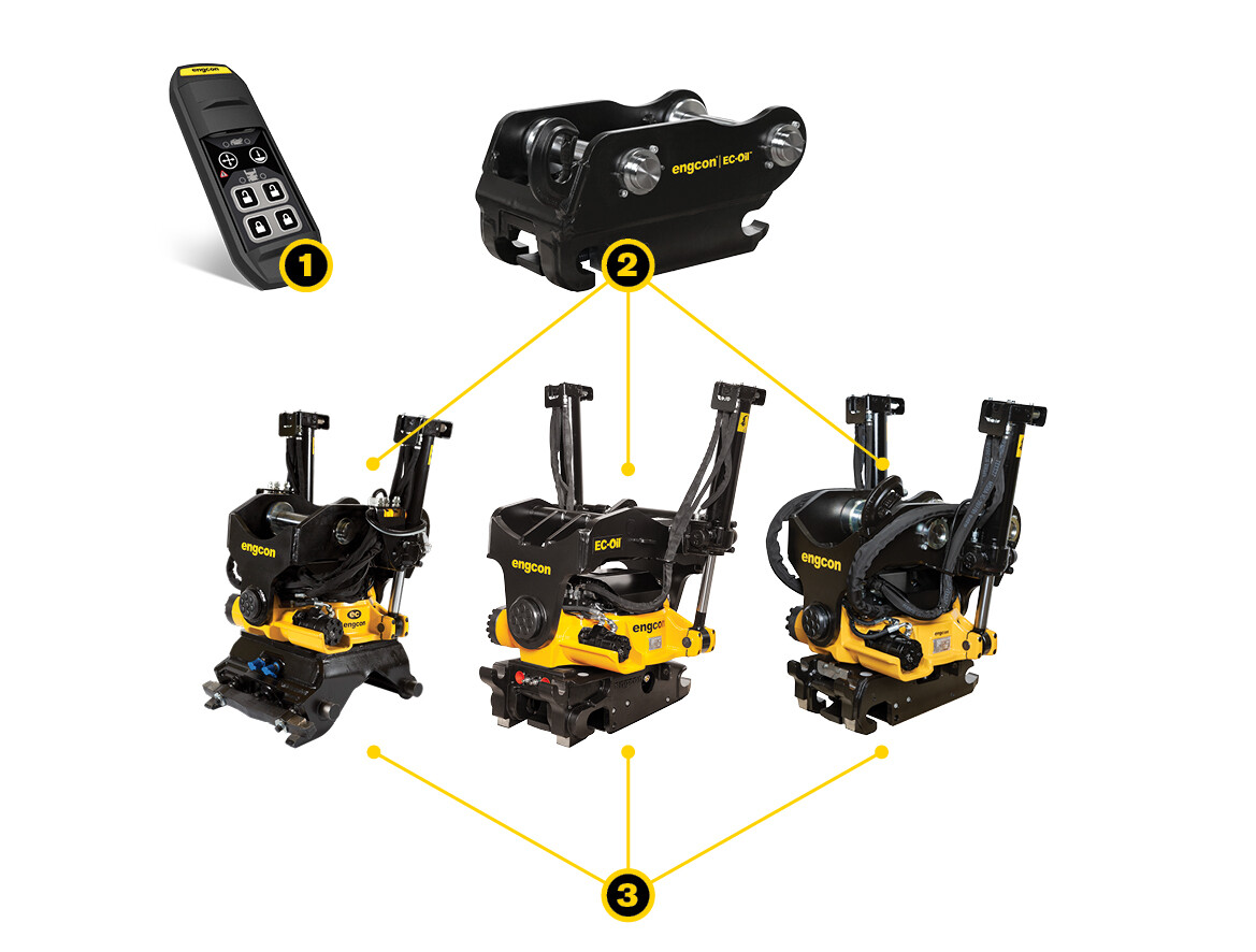 - Univerzální kompatibilita: Standardizace se vztahuje na všechny naklápěcí rotátory engcon a veškeré používané příslušenství